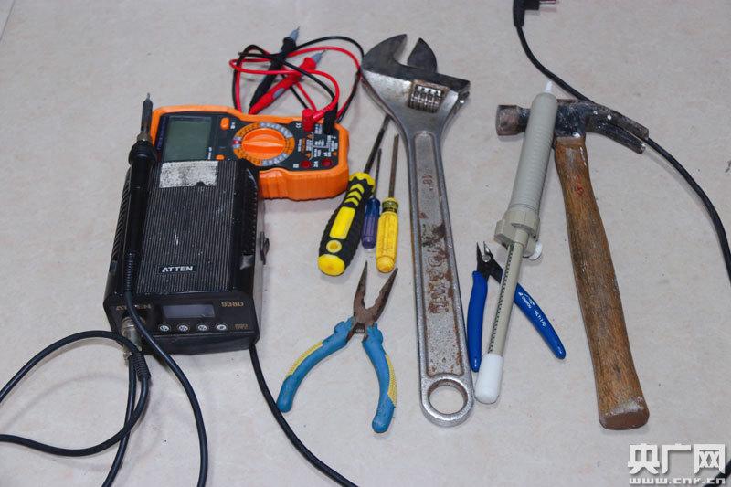 李昌帆的第一代维修工具。木柄羊角锤、生锈的扳手和简易焊台等
