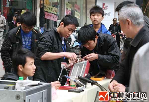 每逢双休日,在玉林城区人民东路,市民总能看到一支青年志愿者服务队的忙碌身影,他们在学校门口设立便民服务点,接收市民的故障电器,电磁炉、电饭煲、电风扇……送旧家电来维修的市民络绎不绝。这支队伍,就是广西玉林农业学校学雷锋家电义务维修小组,他们坚持13年接力学雷锋,用实际行动,践行着社会主义核心价值观。
