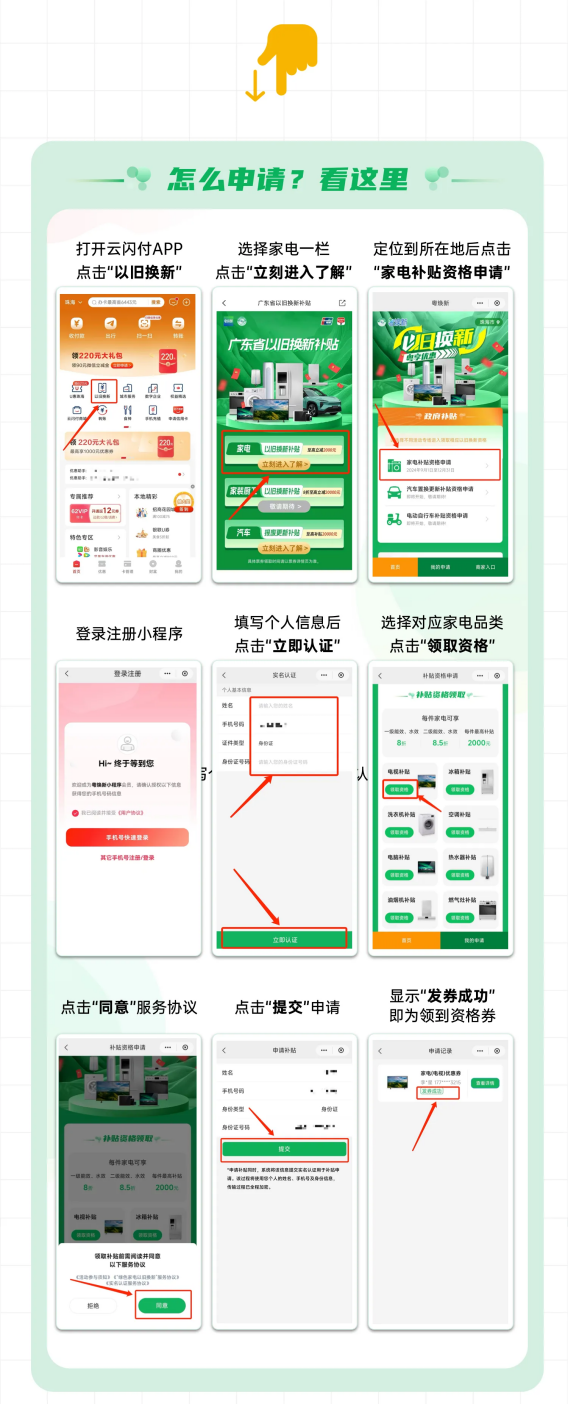 消费者在云闪付APP进入“广东粤焕新以旧换新公共服务平台”申领活动范围家电品类补贴资格券。(微信APP入口即将上线,敬请期待)