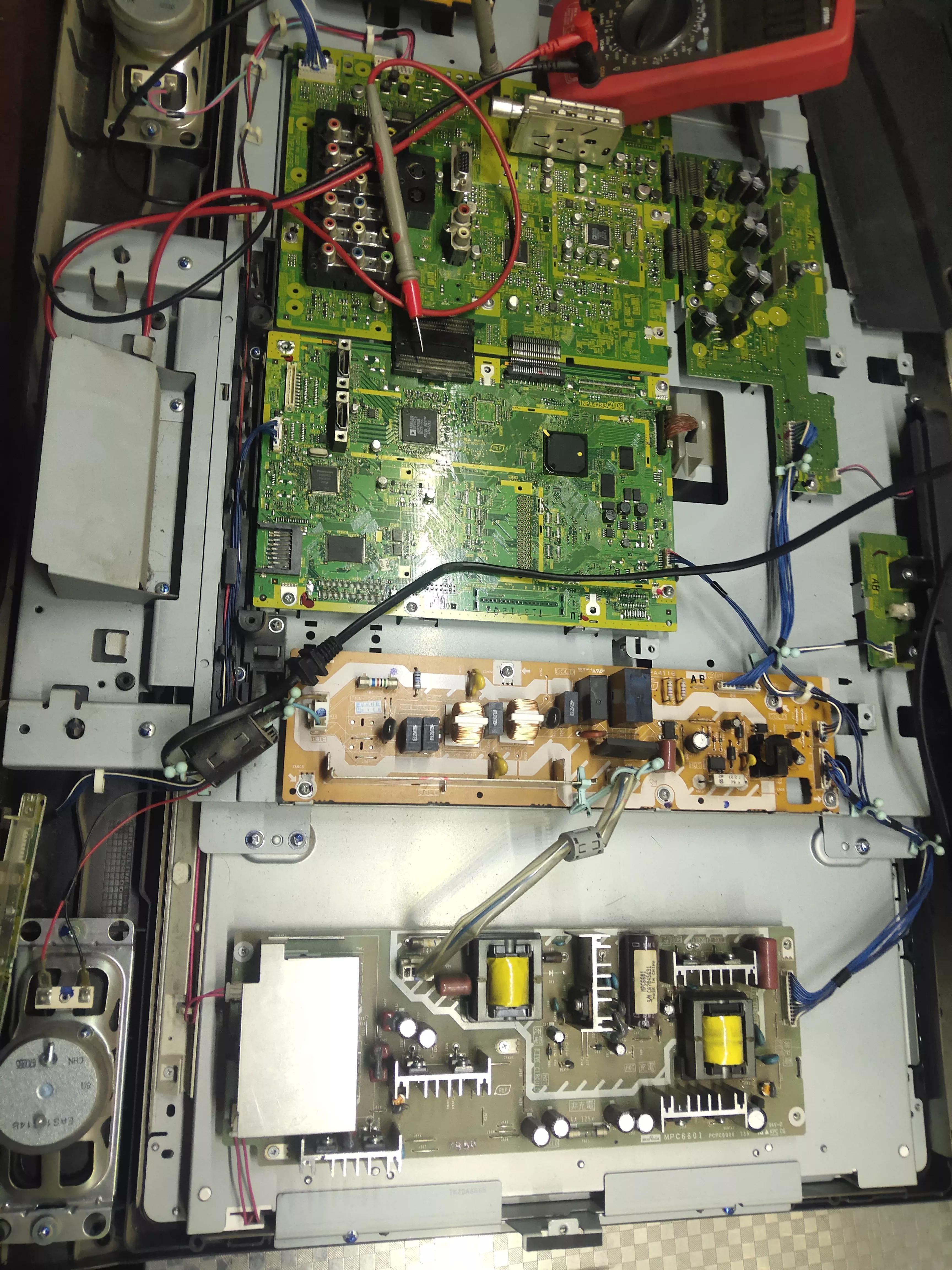 代换过电源高压一体板,AV板,待机电源板,故障现象是灯闪十几下不开机,5v,9v,12v,15v都有,继电器不停反复卡达卡达响不停重复动作,指示灯也是绿灯闪后熄灭重复动作,因为手头没啥资料,而板子插件也没有功能标注导致维修比较困难,经过仔细逐步检查才发现原机电源高压一体板子的高压部分短路,而外购的同一板子上机是绿灯闪后熄灭而后红灯闪一下,这是提示高压故障,无奈拿着两个板子对比着慢慢维修吧,最后发现高压检测取样电路电路板铜箔开路,重新连接后图像声音终于正常了,有点感觉到有点不可思议,松下的机器保护功能真强大,这么点问题造成如此故障,如果是国产机器就不会这么难以发现了[不看]