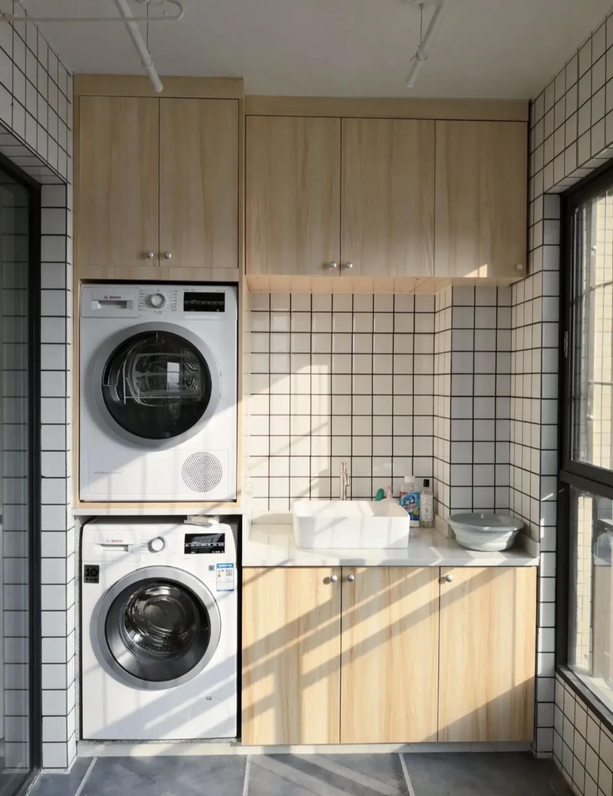以我家里的洗衣机为例,因为以往的经验告诉我,要想解放双手,解放阳台晾衣架,最优秀的搭配一定是独立的洗衣机+独立的烘干机。而且烘干机也一定要选择热泵式的,不要选冷凝式的。