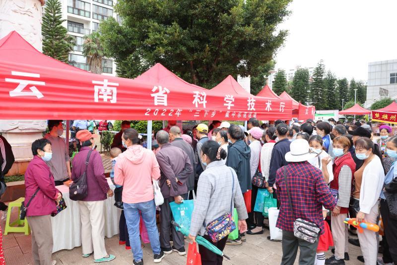 武定县群众在“三下乡”集中示范活动科技下乡服务摊位排队领取农科技术知识材料。