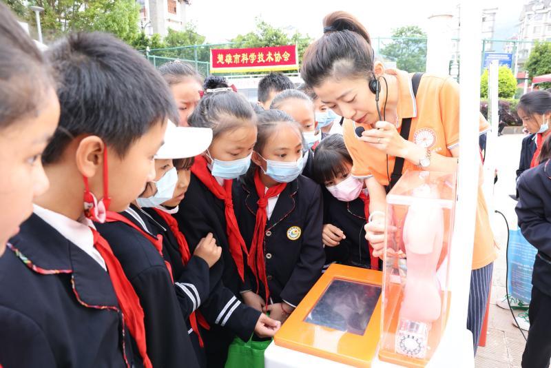 省州科协科普讲解员向小学生讲解人体科普知识。
