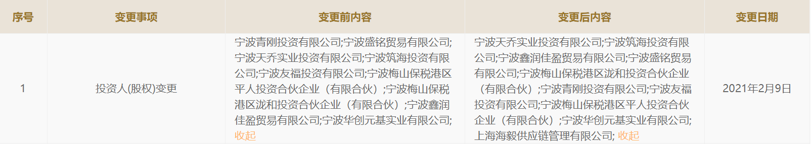 2月10日,新京报贝壳财经记者自工商资料获悉,杉杉控股有限公司发生股权变更,新增股东上海海毅供应链管理有限公司(“上海海毅”)。