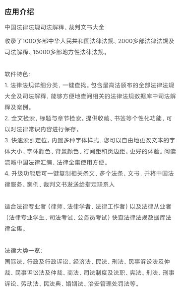 这个手机软件内,收录了1000多部中华人民共和国法律法规、2000多部法律法规及司法解释、16000多部地方性法律法规: