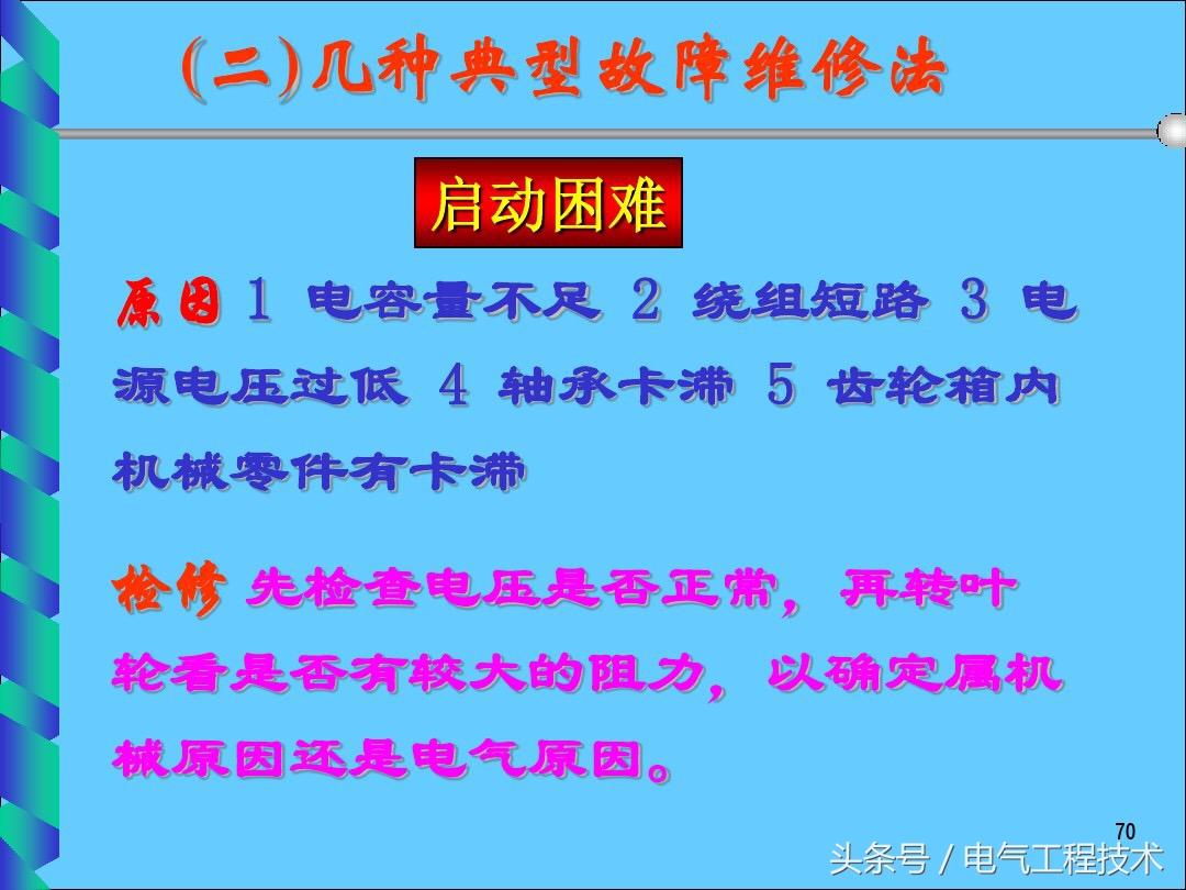电风扇是大家都非常熟悉的电器,大部分的家庭都会使用到,对于电风扇的电路,相对比较简单,一般情况下,电风扇出问题故障了,一般的电工师傅都可以搞定,这是电工基础的技能,但是对于刚入门学习电工的师傅就不同了,虽然简单,但是因为没有相应的理论知识和动手实践经验,所以在电路故障的排查过程中自然也会比较慢,其实电工师傅们都知道,电风扇本身的故障就没那么多,高频发的故障也就那么几个,如果有电工师傅总结好了,就可以直接拿来维修使用了,今天我们就重点来看一下电工师傅总结好的25个电风扇常见的故障排查以及解决方法,希望可以对于电工初学者有帮助: