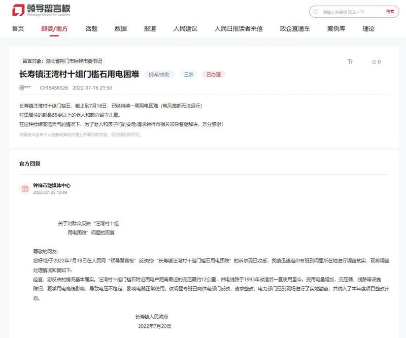 人民网武汉7月26日电 (关喜艳)夏日炎炎,暑热难耐,连日来,湖北各地持续高温。7月16日,一网友在湖北省钟祥市委书记板块下留言,反映用电困难,风扇都无法运行,对村民生产生活和身体健康造成严重影响,企盼解决。对此,钟祥市长寿镇人民政府回应:已纳入整改。