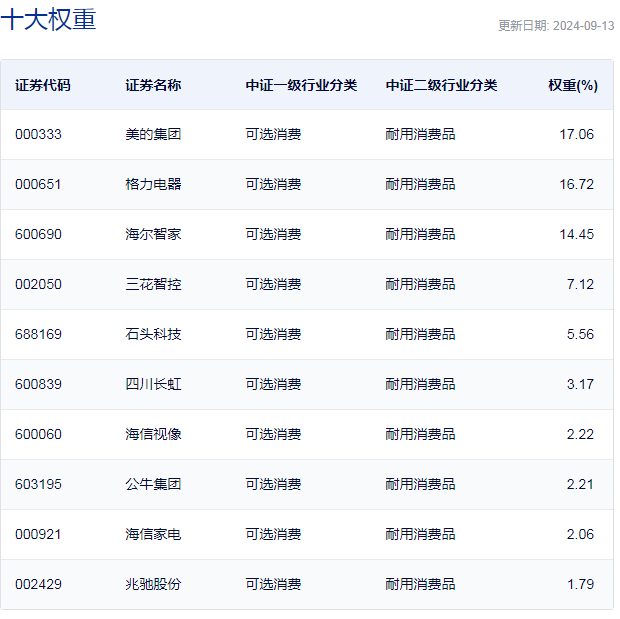 中证全指家用电器指数主要权重股