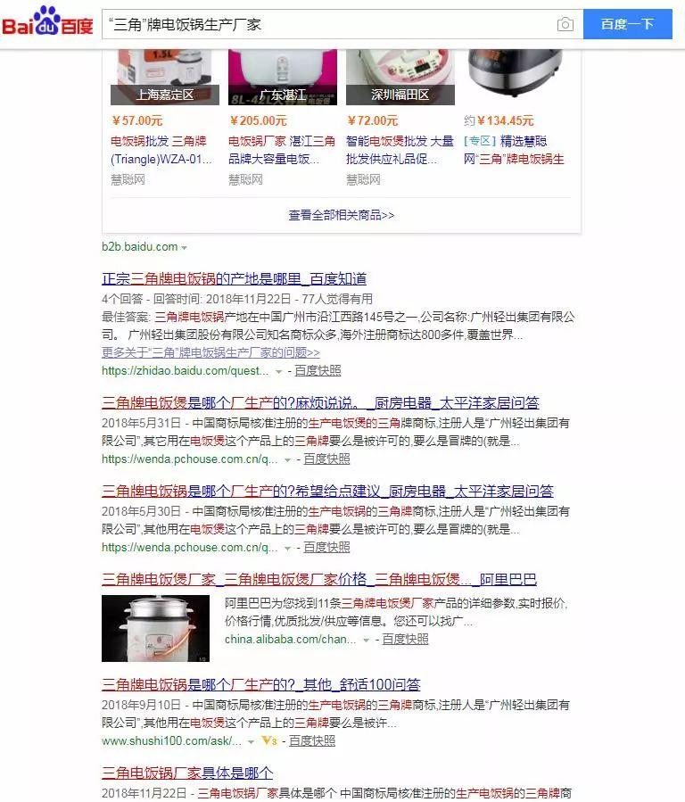 另外,中国质量新闻网注意到,在百度上搜索“三角”牌电饭锅生产厂家字样,跳出的页面内容大多是“‘三角’牌电饭锅哪个厂家生产的好、哪个厂生产的才是正宗的、生产厂家到底是哪个啊……”这类疑问。