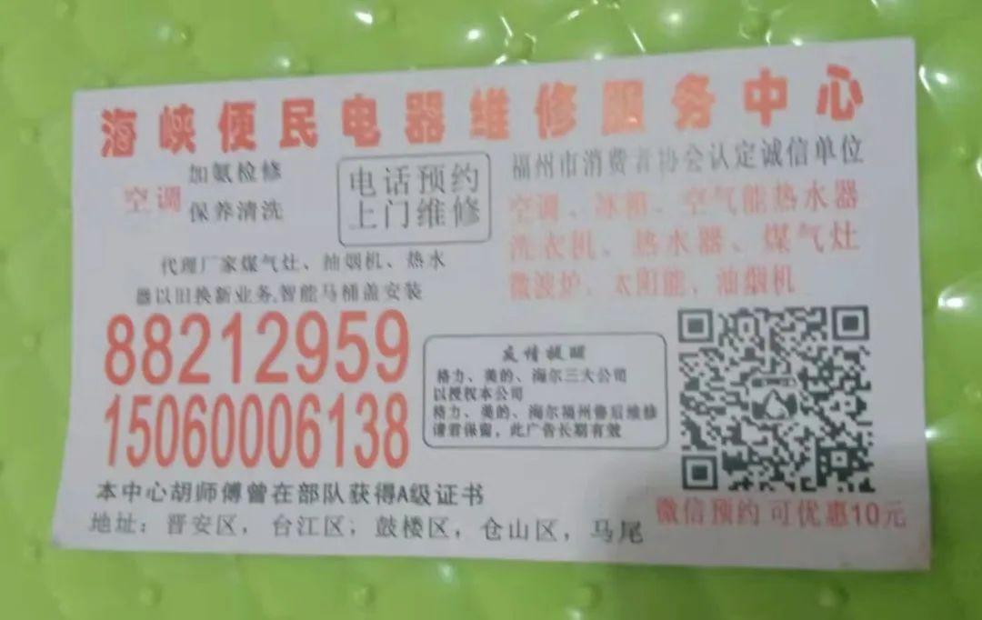 宣传小卡片上还以醒目方框标示“格力、美的、海尔三大公司以授权本公司 格力、美的、海尔福州售后维修”,不但假冒品牌商家授权,连描述都有错别字。消费者如需家电售后服务,应通过官方服务热线联系,切莫相信无良商家的信口雌黄。