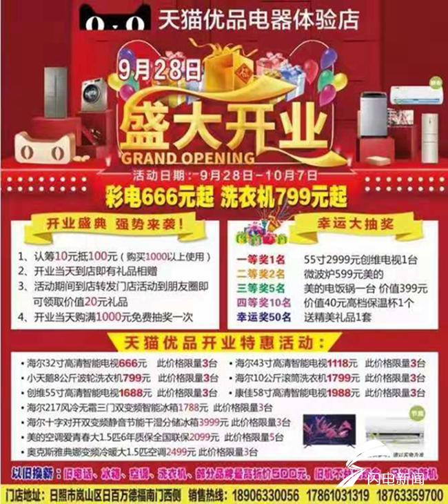 日照岚山区天猫优品电器体验店定于9月28日正式开业,期间优惠活动力度非常大。据了解,从9月28日到10月7日活动期间,市民可通过以旧换新的方式,旧家电直接抵扣现金,然后以最优惠的价格购买新家电;品牌高清智能电视价格降至666元,洗衣机降至799元。