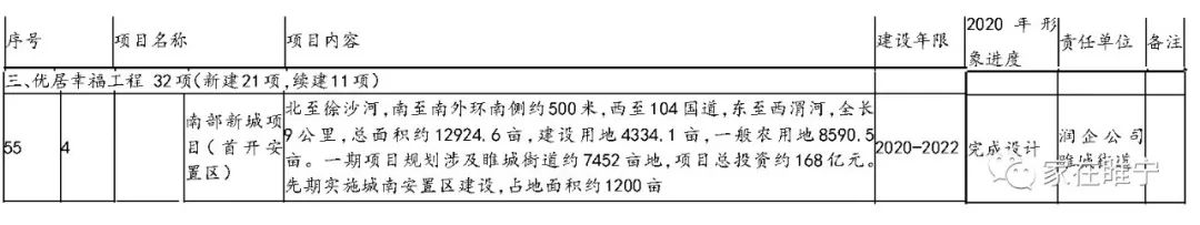 南部新城项目北至徐沙河,南至南外环南侧约500米,西至104国道,东至西渭河,全长9公里,总面积约12924.6亩,建设用地4334.1亩,一般农用地8590.5亩。一期项目规划涉及睢城街道约7452亩地,项目总投资约168亿元。先期实施城南安置区建设,占地面积约1200亩。2020年形象进度:完成设计,可能还要等等了。