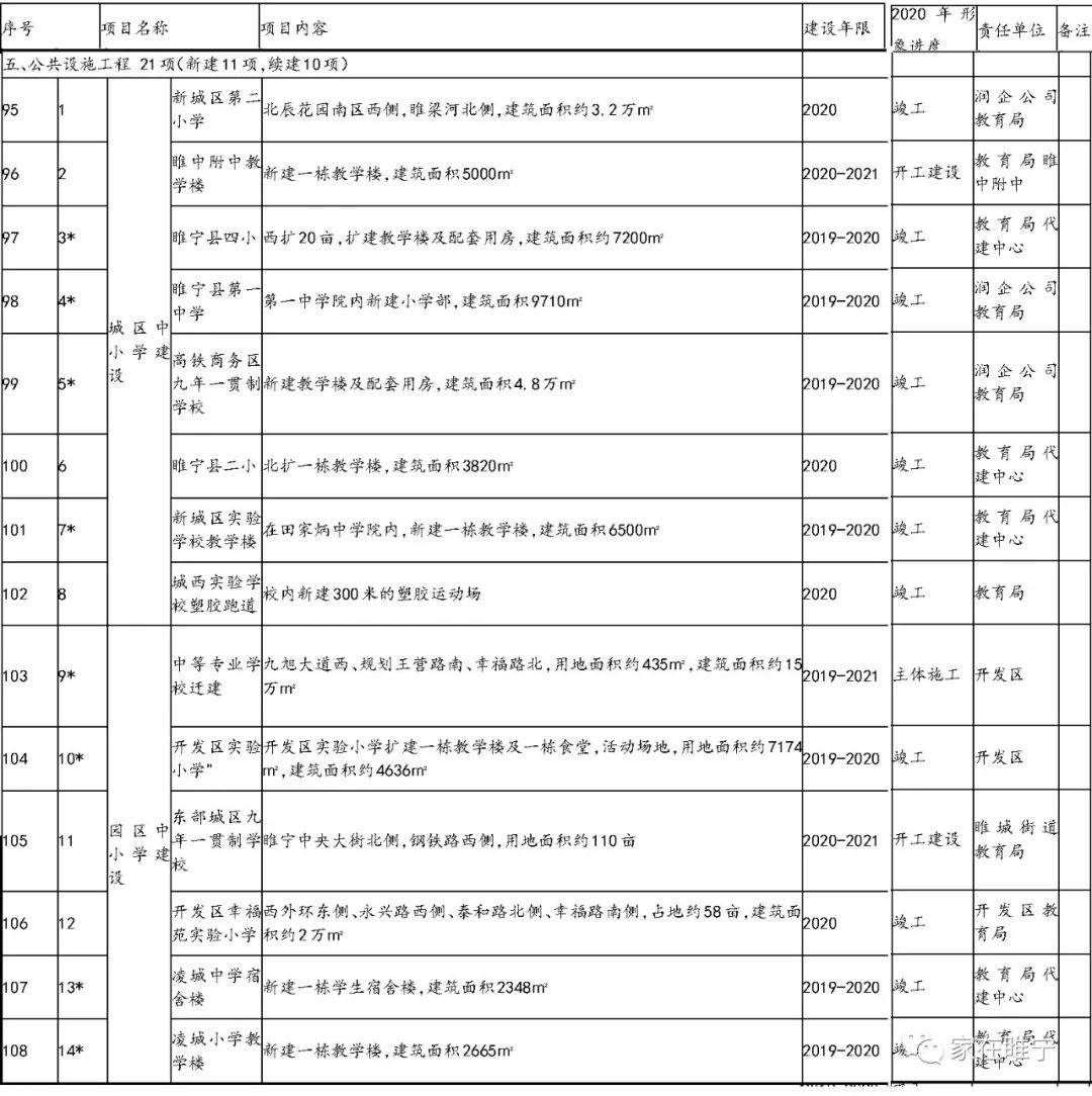 公共设施工程中我们最关心的还是学校问题了,从表格内看到,在2020年竣工的学校有:新城区第二小学、睢宁县四小西扩20亩、睢宁县第一中学内新建小学部、高铁商务区九年一贯制学校、睢宁县二小北扩一栋教学楼、新城区实验学校教学楼(田家炳中学院内)、城西实验学300米的校塑胶跑道、开发区实验小学、开发区幸福苑实验小学、第一中学院内小学部。