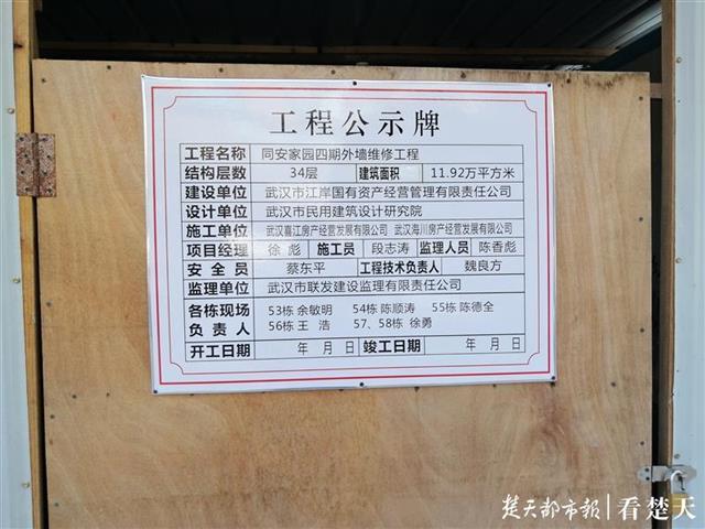 据施工方介绍,因为开发商认为房屋已过质保期,其不再负责维修,且小区业主又不同意使用住宅专项维修资金,因此资金问题一直没有落实。当时只能通过搭建脚手架,来防止高空坠物。直到今年4月,通过江岸区政府协调筹资,同安家园四期的外墙维修工程正式启动。