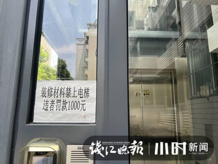 一些单元的电梯口,贴着“装修材料禁上电梯 违者罚款1000元”的告示。电梯间里贴着一位正在装修的沈姓业主的温馨提示。