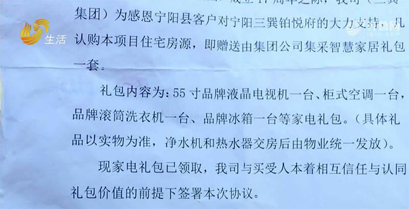 泰安的徐女士去年五月份在宁阳县的三巽铂悦府购买了一套房子,当时开发商承诺送大礼包,可是现在交房一年多的时间了,家居大礼包还没有收到。