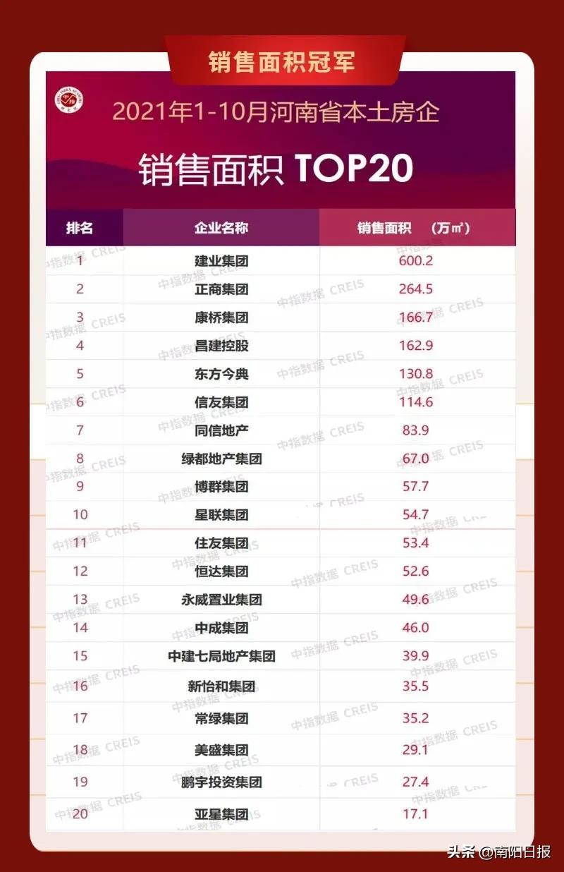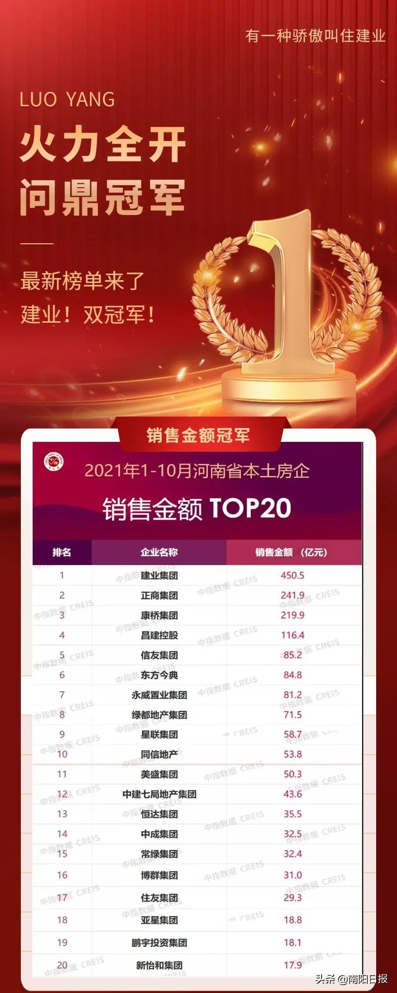 据中指研究院最新发布数据显示,2021年1-10月,河南省本土房地产企业销售业绩金额排行榜、面积排行榜双榜单中,建业集团都是销售冠军——450.5亿元!600.2万平方米!