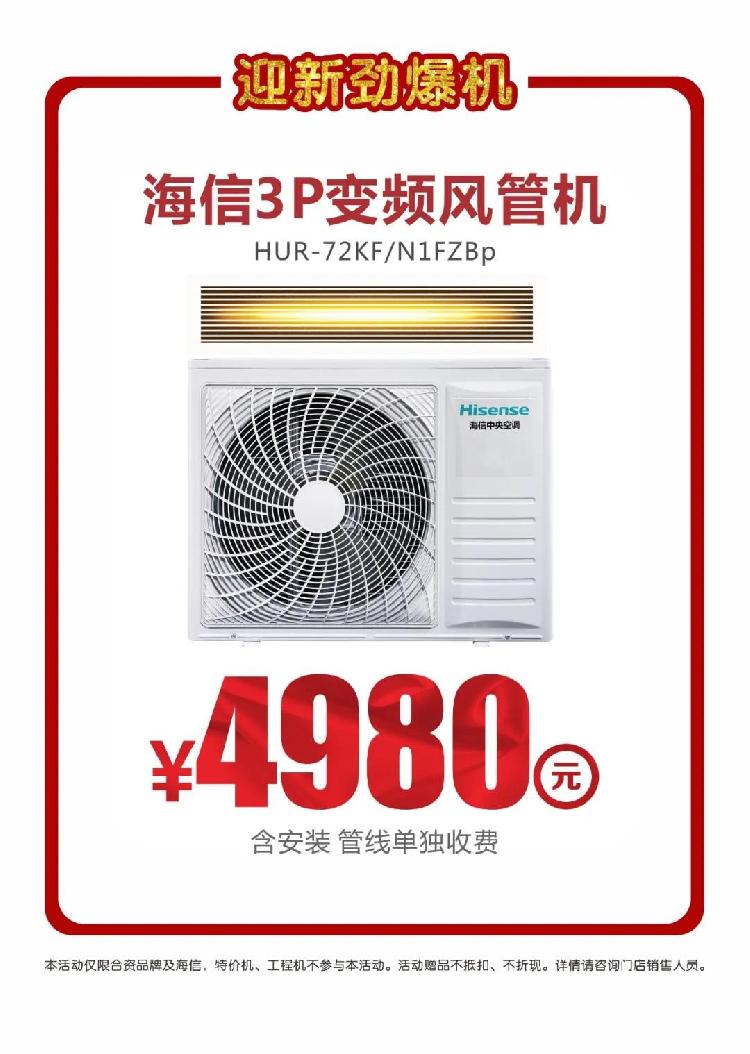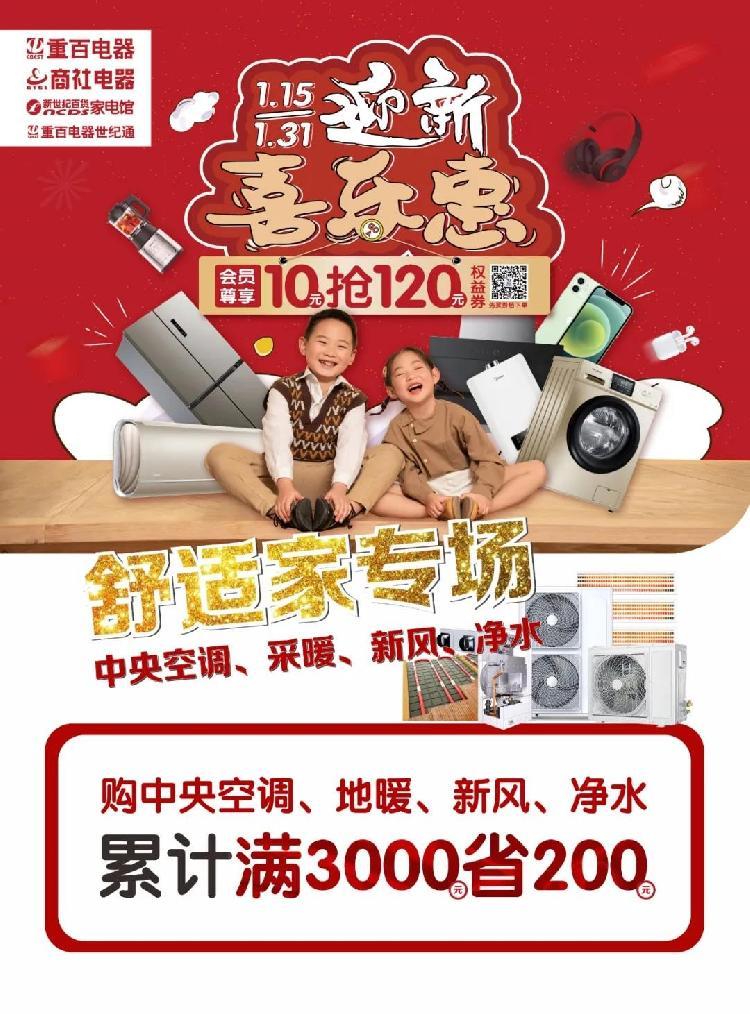 据了解,1月15日至1月30日,重百电器“迎新喜乐惠”舒适家专场,中央空调、采暖、新风、净水累计满3000元省200元。还有海信3P变频风管机含安装4980元等迎新劲爆机,更有联单送好礼,包邮到家!更多活动可以到就近门店咨询。