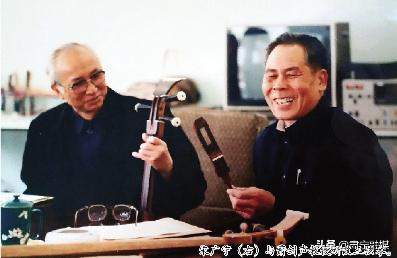 ▲肖剑声(右)与宋广宁在研究研制人造皮三弦