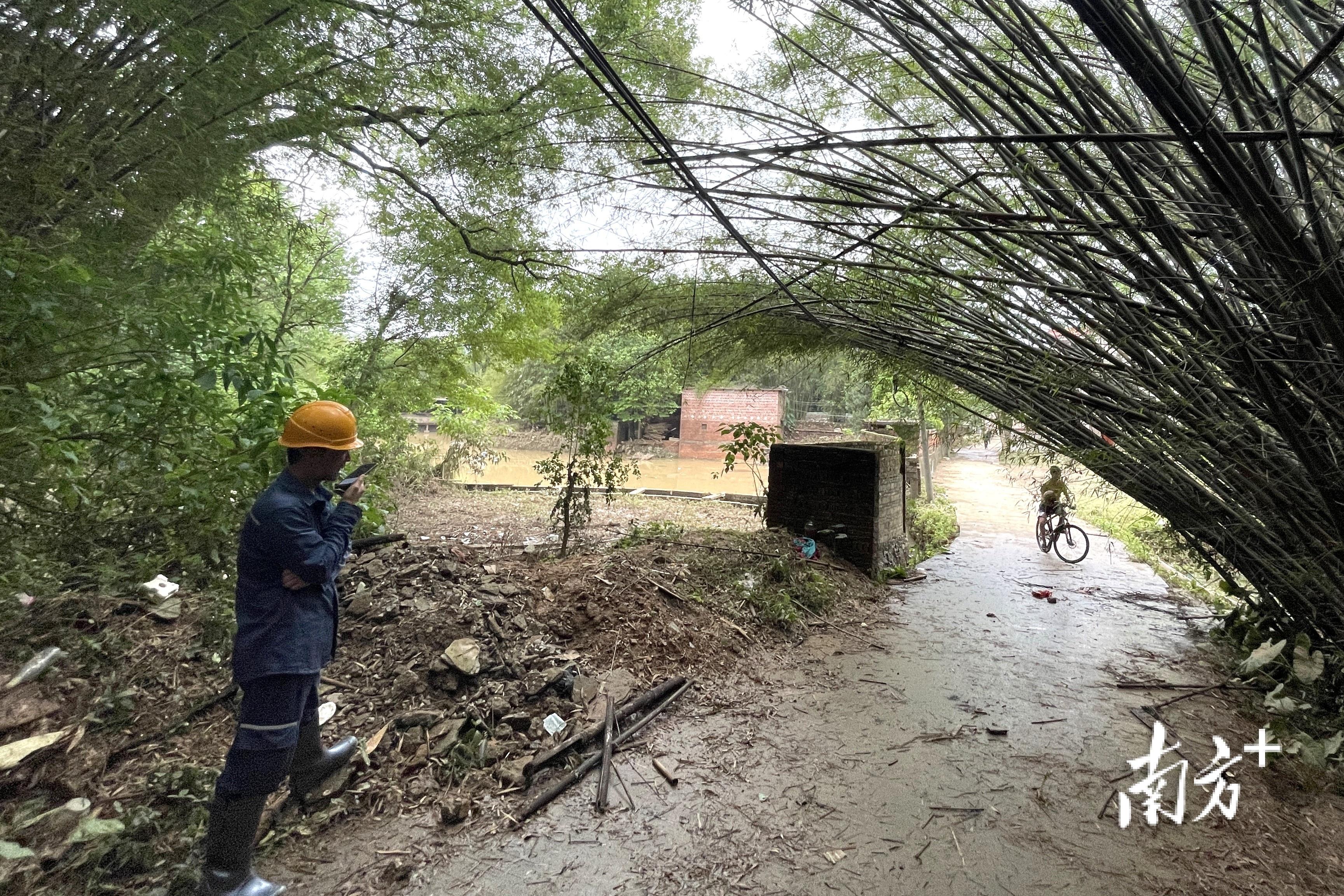 一组队员对10千伏范村线进行灾后巡视,为后续抢修复电做好准备。陈鼎 摄