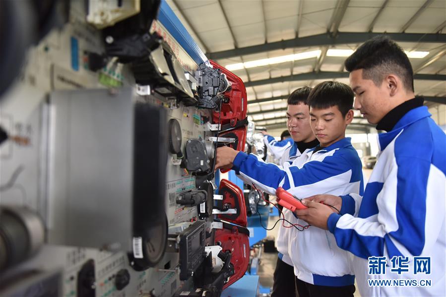 11月10日,河北省威县职业技术教育中心学生在车身电器实训车间练习操作技能。 近年来,河北省邢台市威县职业技术教育中心以就业市场需求为导向,创新“校企合作”“定向培养”“工学结合”的人才培养模式,培养“订单式”职业人才,让学校、企业、学生多方共同受益。 新华社记者 朱旭东 摄