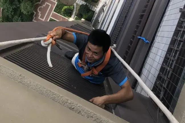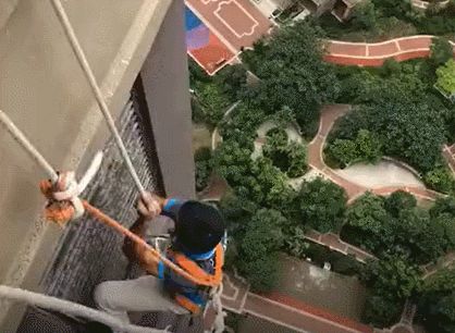 下午16:00,赣州市章贡区创新家电维修部4位师傅准时到达用户家。了解了安装环境后,师傅们戴好安全绳,全副武装,动作敏捷,不一会儿就从顶层降到34层。