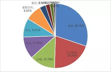 根据投诉性质(见图一、表一所示),质量12168件,占30.19%;售后服务8178件,占20.29%;价格5154件,占12.79%;合同4496件,占11.16%;安全3794件,占9.41%;虚假宣传3236件,占8.03%;假冒1256件,占3.12%;其他874件,占2.17%;计量767件,占1.90%;人格尊严381件,占0.95%;其中,质量、售后服务、价格、合同、安全占据了消费者投诉的前5位。