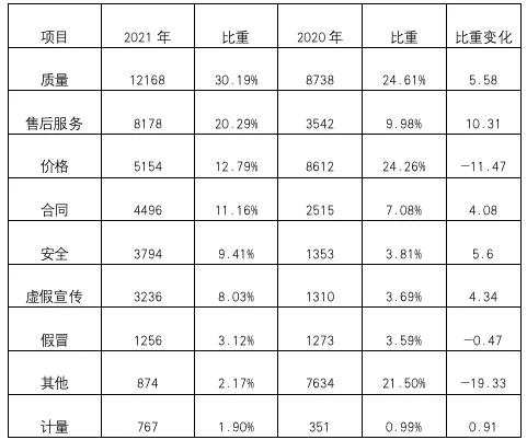1月7日,湖南省消保委公布了2021年受理消费者投诉情况。报告显示,2021年,省消保委系统共受理消费者投诉40304件,其中质量、售后服务、价格、合同、安全问题最让消费者烦心,占据投诉榜前5位。