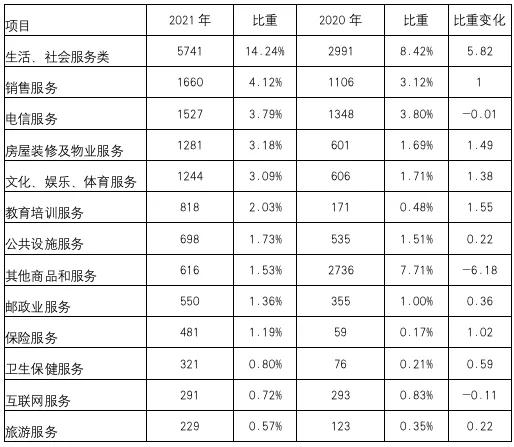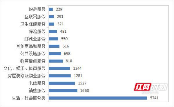 除其他商品和服务、电信服务、互联网服务投诉比重小幅下降外,其余服务类投诉比重相比去年均有不同程度的上升。其中,教育培训服务和生活、社会服务类增长幅度较大,比去年分别增长了647件和2750件,增长率分别为378.36%和91.94%。具体情况见表三。