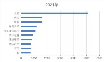 从商品类别来看,2021年食品类投诉6767件,投诉量位居所有商品类别榜首。投诉的主要问题是:更换标签销售过期食品;使用过期原材料;食物中有异物;外卖食品不合格,存在包装没有封口、计量不足等问题。