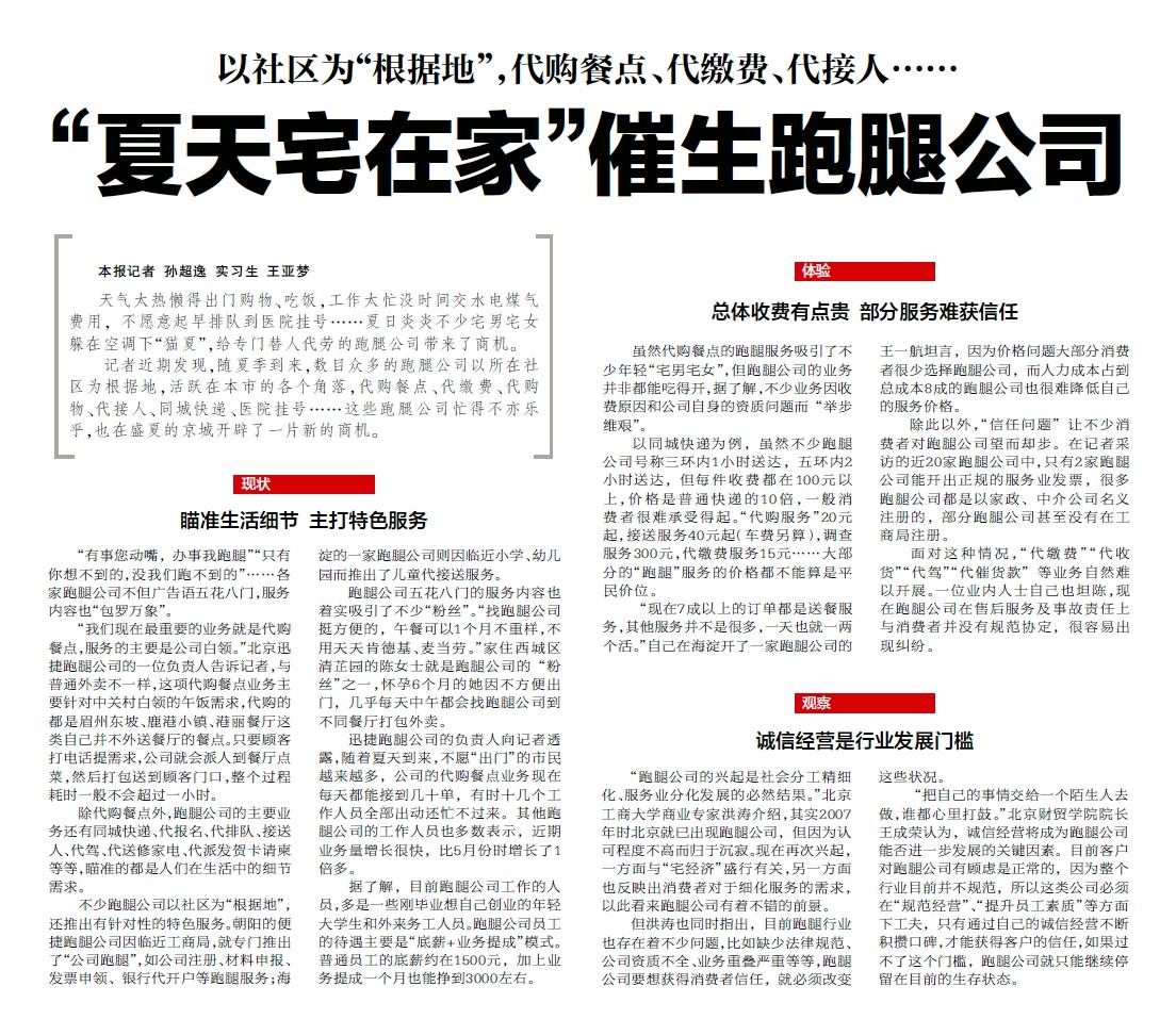 除代购餐点外,跑腿公司的主要业务还有同城快递、代报名、代排队、接送人、代驾、代送修家电、代派发贺卡请柬等等,瞄准的都是人们在生活中的细节需求。