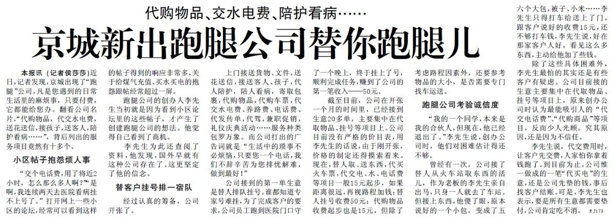 真正“为民”服务的“跑腿公司”2005年出现在京城。凡是日常生活里的麻烦事,“跑腿公司”都能代办。