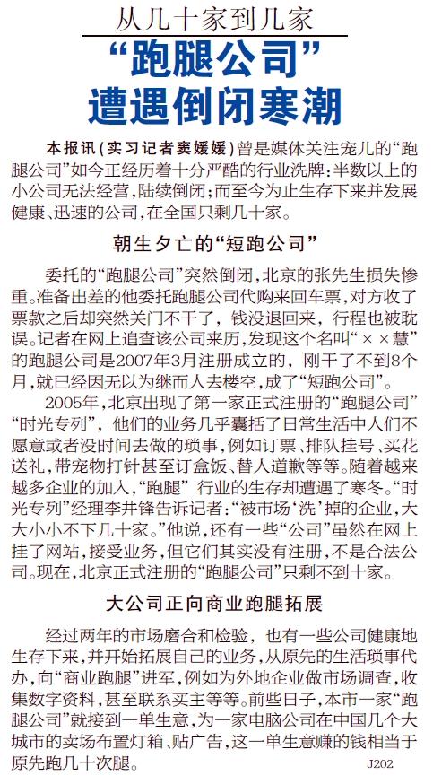 随后,“跑腿公司”在北京甚至全国都快速发展。不过,仅仅两年后,“跑腿公司”就经历了严酷的行业洗牌。2007年,被市场淘汰掉的企业,大大小小不下几十家。还有一些“公司”虽然在网上挂了网站,接受业务,但它们其实没有注册,不是合法公司。北京正式注册的“跑腿公司”只剩不到十家,全国只剩几十家。