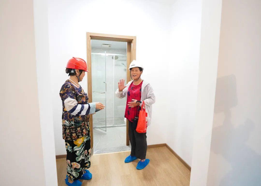 为了让百姓对样板房空间格局有更确切的概念,当天进行展示的60平方样板房还添置了家具饰品。从进门的就餐区、客厅活动区到标配的卧室套间,精心布置的空间让村民们赞不绝口。“你看到了吗?漂不漂亮?以后我们老两口就住60平方的。”现场,张阿姨一边参观一边和老伴打视频电话。一起参观的村民也纷纷拿出手机,拍下视频、照片和家人分享。