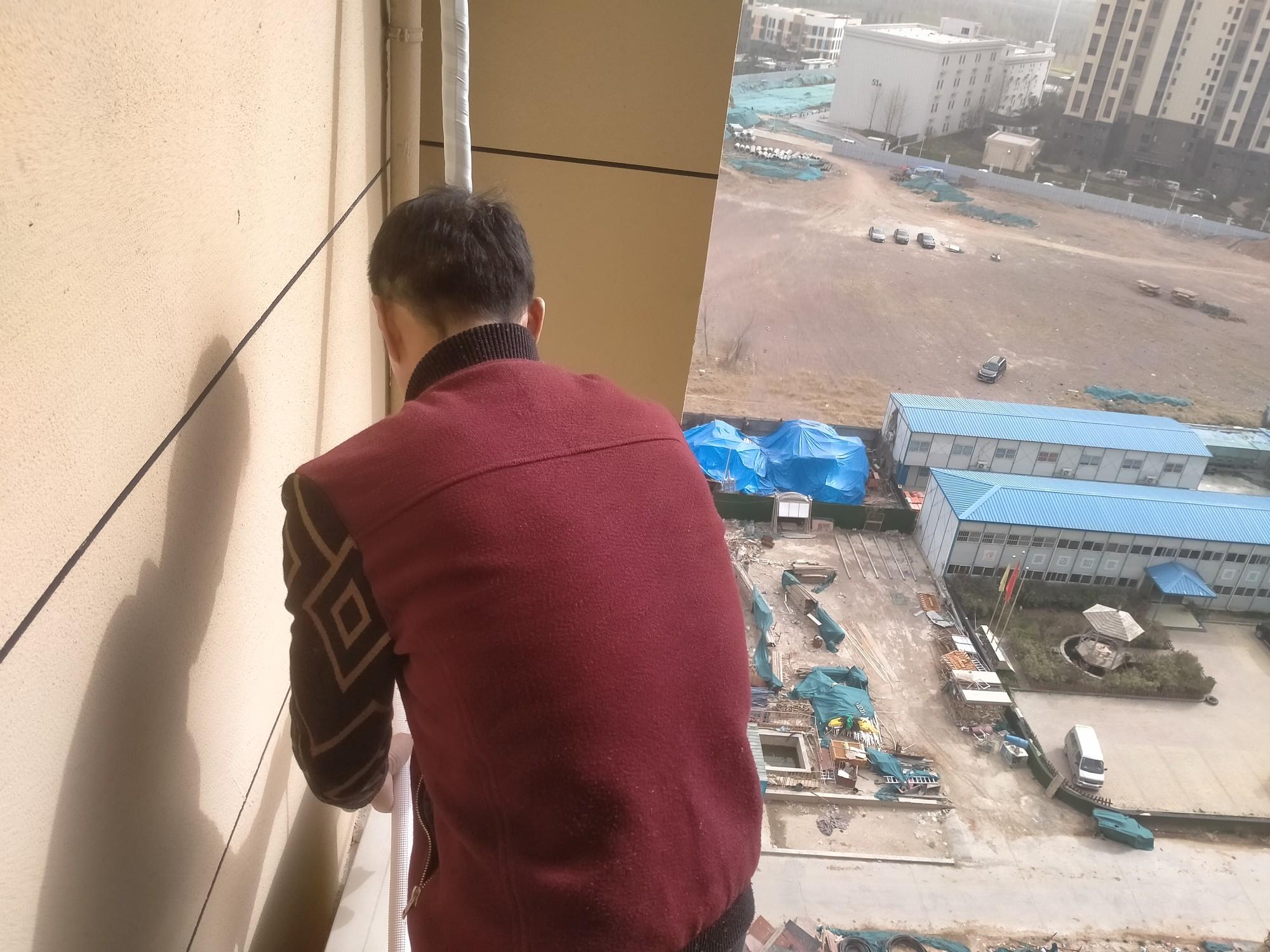 一栋居民楼15层,冯文祥手里拿着线管子,在儿子协助下,正蹲在窗户外面安装一台空调外挂机,客厅里站着一位老人。戴着深蓝色帽子,有点驼背,右侧口袋里面装着一个定位器。