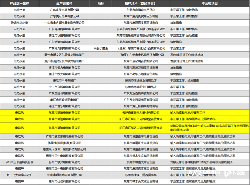 不合格家电涉及东莞的详情名单,标黄为东莞生产企业,其余为东莞经销商。