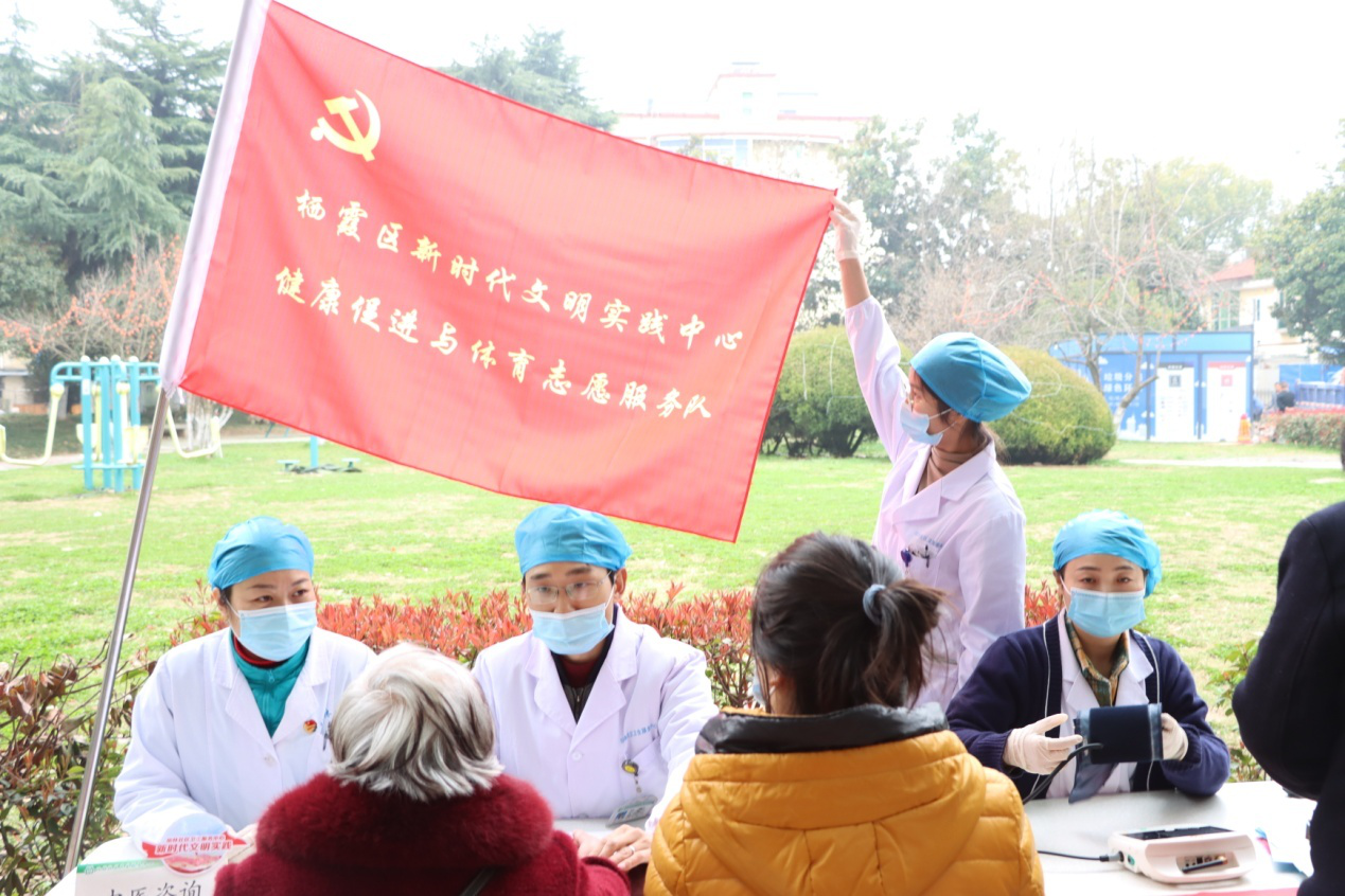仙林街道新时代文明实践所的健康促进志愿者们一大早就在来到仙鹤山庄小区广场布置了义诊会场,为居民提供量血压、测血糖、中医咨询等服务项目,居民们有序地前来问询、检查,大家自觉佩戴口罩,不拥挤,恭谦让,其乐融融。