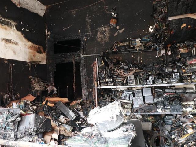 隔壁小卖铺的老爷爷老奶奶一早来开门营业也是吓了一跳,因为该间店铺前后被隔成了两间,前面是维修店店铺,后面是小卖铺的仓库,前后还有一扇木门,早上一把火把他们也波及了,空调损坏了,一些货品也被泡水熏黑了,墙壁也被熏黑了,但是最庆幸的是夫妻俩昨晚回新家住了,老爷爷看着仓库不断地拍着胸脯说“真是命大,真是幸运哦!”