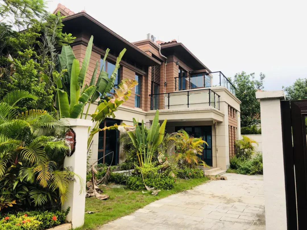 站在高处鸟瞰小区,蓝天白云之下,椰子树、艳红的三角梅,构成一幅美丽的海岛风景图。在图画里,9栋高楼直耸云宵,旁边还围着200栋墅黄墙红瓦的别墅。