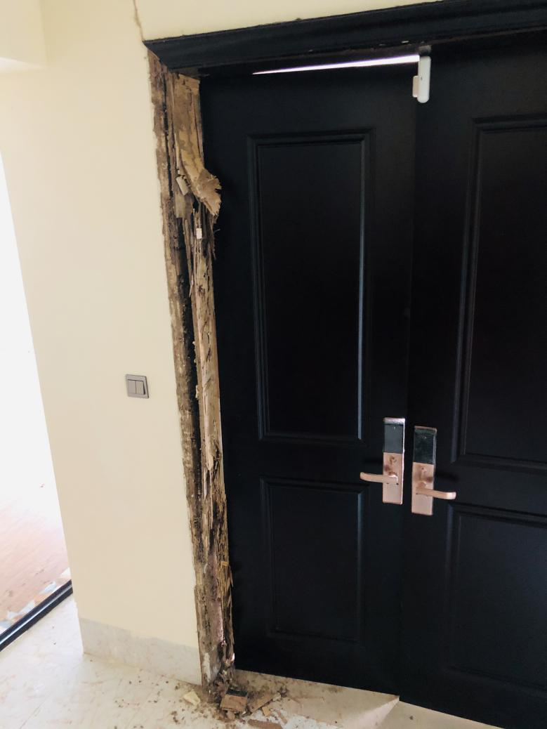 但张羚等10余人来到陵水清泉城别墅时,眼前的情景令他们大吃一惊:入户大门稍微用力一推就摇摇欲坠,门框成蜂窝状,揭开表层一看,里面是成千上万的白蚁。除此之外,厨房和卫生间家具也被白蚁蛀得千疮百孔。