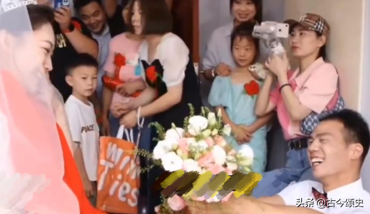 到达接亲的房间后,新郎杜亚甫站在他的特制扶手上,双手捧着一束鲜花,面色泛红地向坐在床上的新娘徐冯晨大声表白道: