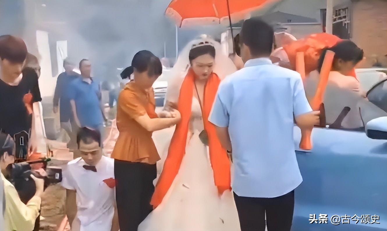 河南洛阳的嵩县黄庄上,身材窈窕、长相靓丽的新娘徐冯晨穿着一席清丽脱俗的白色婚纱,满脸笑容地从迎亲的轿车上走下来。