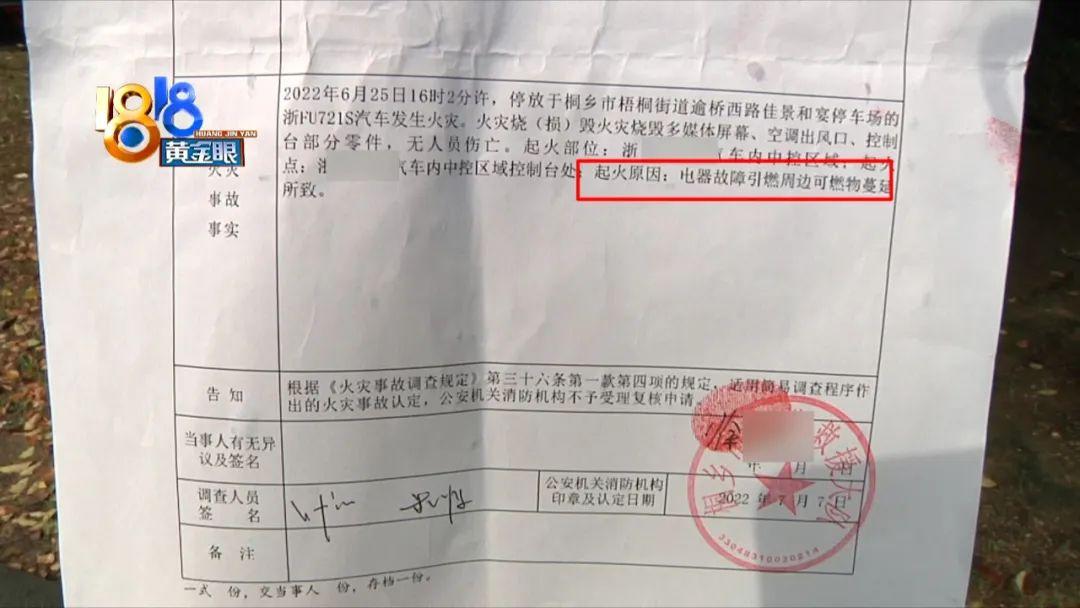小徐说,当时停车场的工作人员拿来了灭火器,及时把火扑灭,才没有导致火势蔓延。因此,车子受损的部分主要就集中在中控台这里 。桐乡消防出具的火灾事故简易调查认定书上写着,起火原因是:电器故障引燃周边可燃物蔓延所致 。