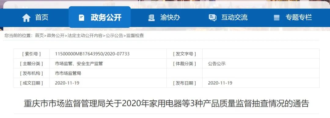 近日,重庆市市场监督管理局网站通告2020年家用电器等3种产品质量监督抽查情况。据通告,本次家用电器类产品抽查涉及江北区、渝北区、九龙坡区、南岸区、璧山区、巴南区、永川区、铜梁区、沙坪坝区、大渡口区、奉节县、北碚区、开州区、涪陵区、长寿区、黔江区、垫江县、大足区、彭水县、酉阳县、万州区、江津区、万盛区、秀山县、潼南区、合川区、渝中区、荣昌区、石柱县、丰都县、南川区、綦江区、武隆区等33个区县105家企业的161批次产品,其中合格143批次,不合格18批次 ,合格率为88.8%。