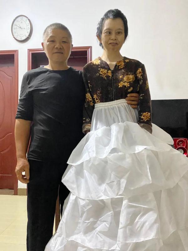 9月初,陈祥龙托着荷叶般散开的裙撑,罩在妻子熊斌身上,再握住她的双手,小心地让她踩小板凳上——她51岁了,身板佝偻,身高一米四不到,只有这样,裙撑才不会拖在地上。