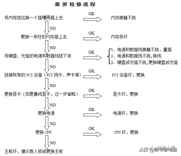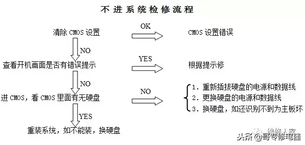 在检修时我们把所有的故障分成三大类:不开机、黑屏、不进系统。