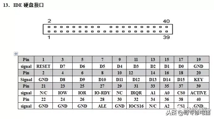 注意:在接口周围有针接顺序接示,如1,2和33,34及39,40样数字指示。我们使用的软驱线和硬盘线红线靠近1的位置。