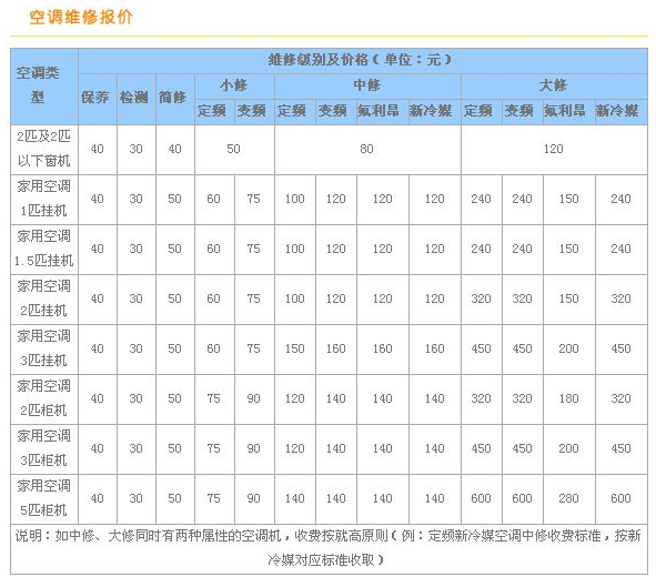 在夏天,空调是家里最重要的电器之一,天天都离不开空调。既是使用频率最高的季节,也是维修频率最高的季节。我们都经理过请师傅上门维修,有的报价至少100上门费,维修配件等另外报价,普通消费者几乎是师傅开价多少就给多少。今天给大家整理了一份空调维修报价,供大家参考: