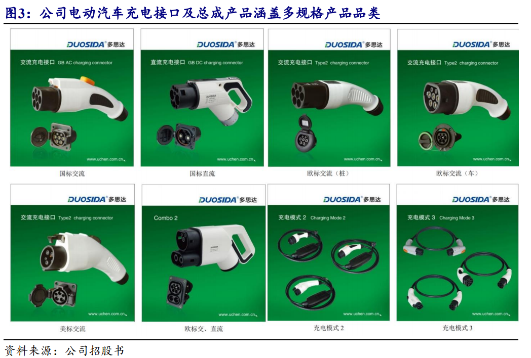 电源连接器相关产品。电源连接器为公司的传统产品,主要应用于柴油发电机、游艇、大型吸尘器等 低压成套家电设备,上述产品主要以直接出口或者成套出口为主。针对电气类产品 各国都有相应的安规要求,因此公司的大部分电源连接器产品均获得了满足该区域的安规认证(产品安全认证)。电动汽车整车高压连接器(子公司多思达连接负责) 产品符合 SAE1742 标准系列,LV216 标准以及汽车行业要求,额定电流 13A~500A,额定工作电压:1000VDC;绝缘阻抗:5000MΩmin;绝缘耐压: 3000VAC60S 具有互锁功能、优越的电磁屏蔽功能、高通载能力、高耐环境性能、优 良的电气性能、防呆功能、轻量化设计。