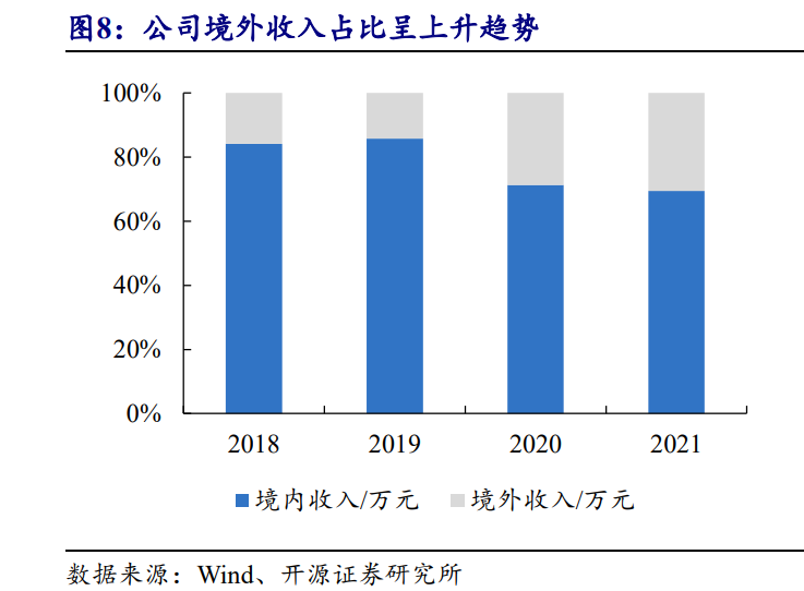 公司营销方式以直接销售为主,经销商销售为辅。公司主要的营业收入和利润 来源为新能源电动汽车充电连接装置、电源连接器的销售。公司近年来的收入主要 来自于新能源汽车行业知名车企、桩企及国外优质客户。公司秉承以“创造价值、 业绩第一、结果导向、超越期望”为经营理念,以“致力于成为全球电动汽车连接 技术的领导者”为愿景,提供高品质产品和增值服务,服务好大客户的同时注重对 其他老客户的维护,以及对新客户、优质客户的开拓。 2021 年,中国境内外营业收入分别为 2.82 亿元和 1.24 亿元,较上年增长 84% 和 101.74%,原因为新能源汽车市场增长迅猛,销量增幅较大引起。2018-2021 年, 公司境内毛利率由 39.29%下滑至 23.81%,境外毛利率由 58.25%下滑至 42.63%。